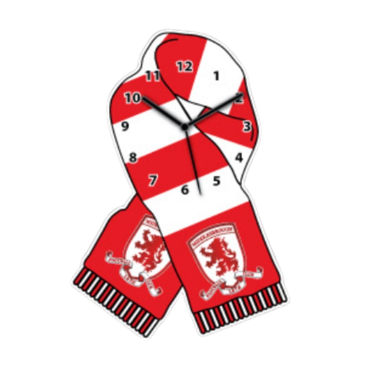 Add a touch of Boro pride to your home with the Middlesbrough FC Wooden Scarf Clock. Crafted in a stylish wooden design and featuring a classic red and white MFC scarf motif, this unique wall clock combines club spirit with practicality. Perfect for any room, it’s a timeless way to show your support for the Boro while keeping track of every matchday moment.